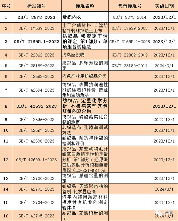 紡織服裝領(lǐng)域多項(xiàng)國家標(biāo)準(zhǔn)發(fā)布,如GB/T 8878-2023《針織內(nèi)衣》、GB/T 21655.1-2023《紡織品 吸濕速干性的評定 第1部分:單項(xiàng)組合法》、GB/T 42695-2023《紡織品 定量化學(xué)分析 木棉與某些其他纖維的混合物》、GB/T 42698-2023《紡織品 防透視性能的檢測和評價(jià)》等。 部分標(biāo)準(zhǔn)目錄如下:
